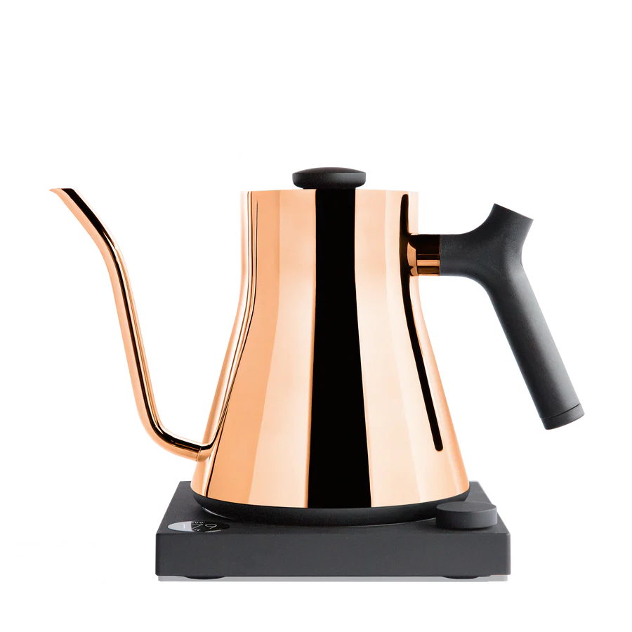 Introducing the electric pour-over Fellow kettle, an essential tool not just for coffee aficionados but also for those new to the art of brewing. This copper kettle offers precision in every aspect: from its meticulously designed pour spout to its exact temperature settings. Experience rapid heating and a suite of advanced features that provide unparalleled control over your pour-over process. Engineered for those who seek perfection in their brewing routine.